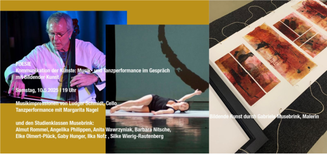 Bewegte Kunst auf Papier, haptisch, gebrochen, verschlossen im Buch oder transformiert zu Haut: Kunst mit viel Poesie. Zu dieser Atmosphäre interagiert Ludger Schmidt mit seinem Cello / E-Cello. Margarita Nagel kommuniziert mit ihrem Körper ausdrucksstark zu dieser sich entwickelnden Atmosphäre.